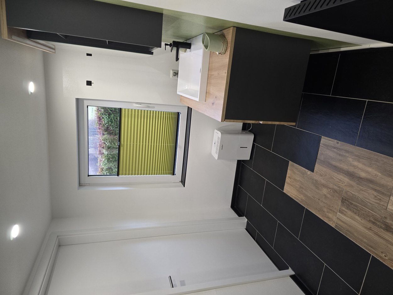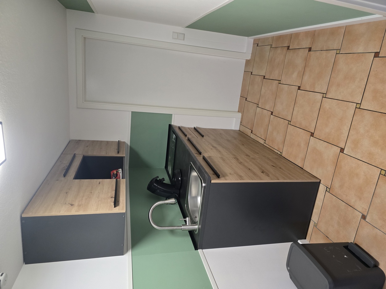 - Küche mit 2 Platten-Herd, Kühlschrank mit Gefrierfach, Senseo-Kaffeemaschine und Airfryer