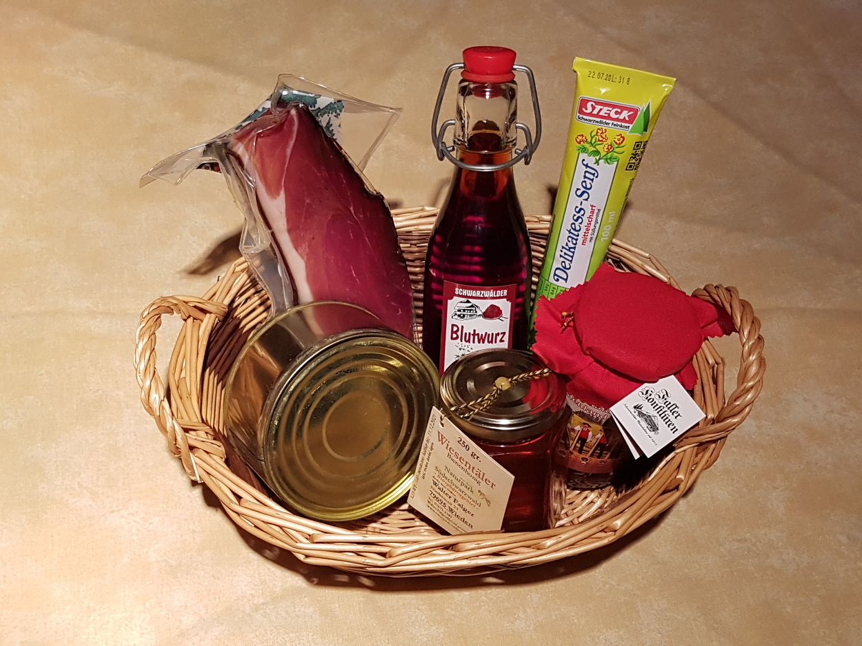 Auf Vorbestellung erhalten Sie bei uns ein Wiedener Aufenthaltskörbchen. Teilen Sie uns einfach vor Ihrer Anreise mit, ob wir Ihnen einen Aufenthaltskorb zum Preis von 25,00 € (inklusive Korb, 20,00 € ohne Korb) bereit stellen sollen. Der Korb beinhaltet folgende Produkte: